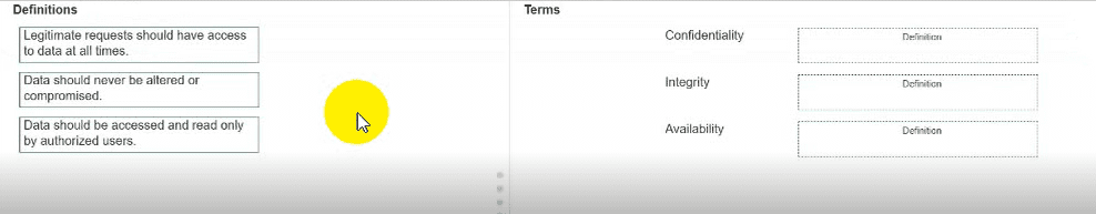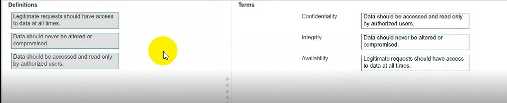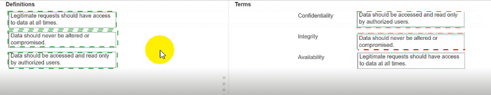 Move each definition from the list on the left to the correct CIA Triad term on the right.