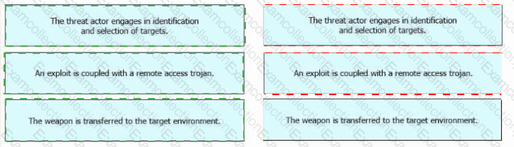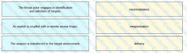 Drag and drop the definitions from the left onto the phases on the right to classify intrusion events according to the Cyber Kill Chain model.