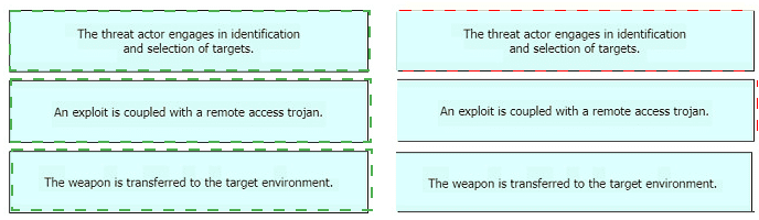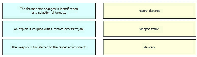 Drag and drop the definition from the left onto the phase on the right to classify intrusion events according to the Cyber Kill Chain model.