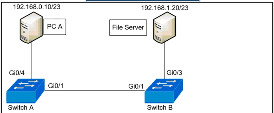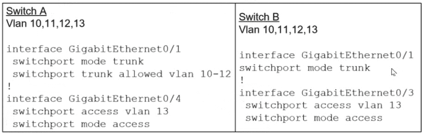 A network administrator assumes a task to complete the connectivity between PC A and the File Server. Switch A and Switch B have been partially configured with VLAN 10, 11, 12, and 13. What is the next step in the configuration?