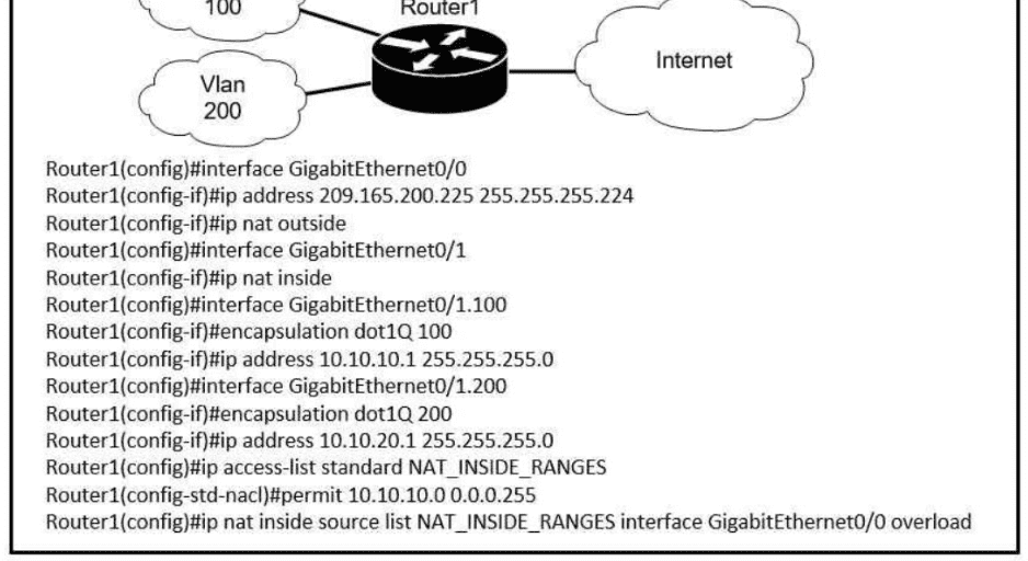 Users on existing VLAN 100 can reach sites on the Internet. Which action must the administrator take to establish connectivity to the Internet for users in VLAN 200?