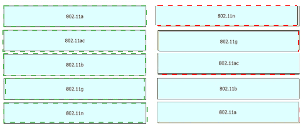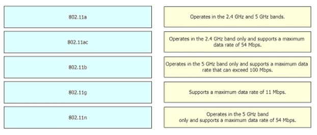 Drag and drop the 802.11 wireless standards from the left onto the matching statements on the right