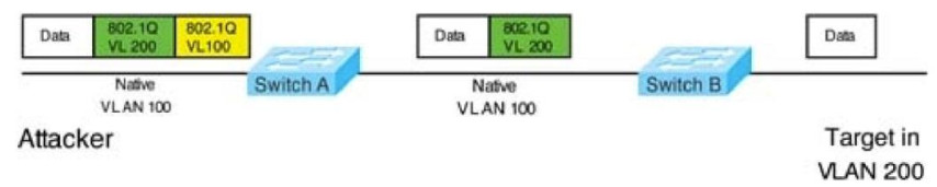 In this attack, the attacking computer generates frames with two 802.1Q tags. The first tag matches the native VLAN of the trunk port (VLAN 10 in this case), and the second matches the VLAN of a host it wants to attack (VLAN 20).