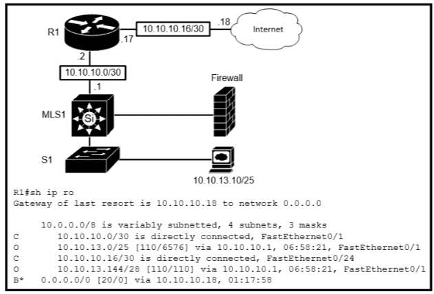 Which type of route does R1 use to reach host 10.10.13.10/32?