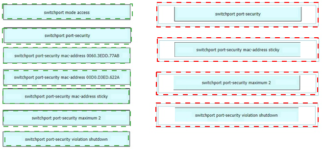 An engineer is tasked to configure a switch with port security to ensure devices that forward unicasts multicasts and broadcasts are unable to flood the port The port must be configured to permit only two random MAC addresses at a time Drag and drop the required configuration commands from the left onto the sequence on the right Not all commands are used.