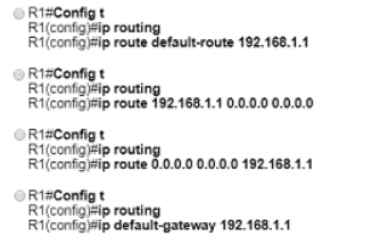 Router R1 must send all traffic without a matching routing-table entry to 192.168.1.1. Which configuration accomplishes this task?