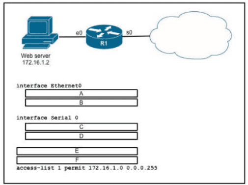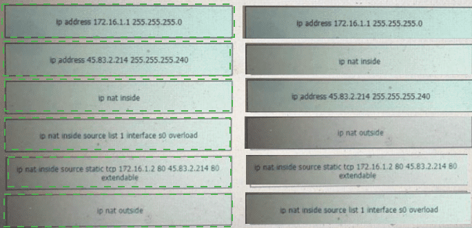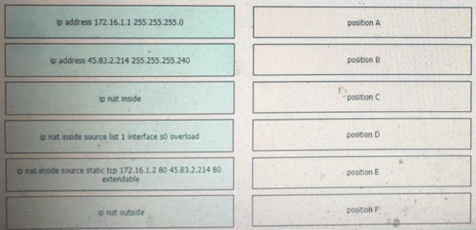 An engineer is configuring the router to provide static NAT for the webserver Drag and drop the configuration commands from the left onto the letters that correspond to its position in the configuration on the right.