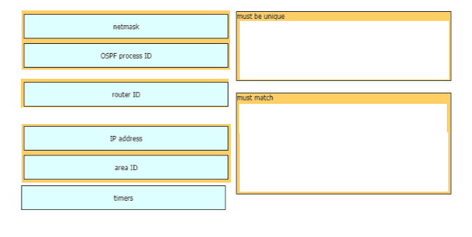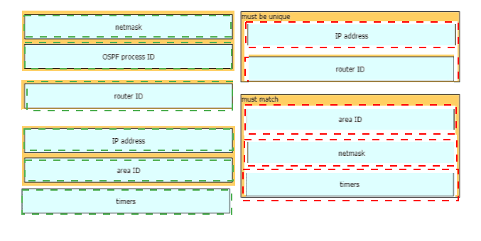 A network engineer is configuring an OSPFv2 neighbor adjacency Drag and drop the parameters from the left onto their required categories on the right. Not all parameters are used