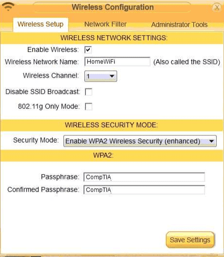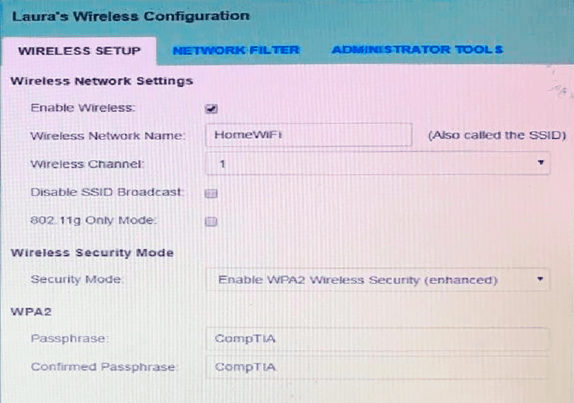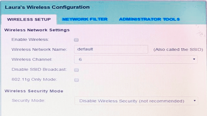 Laura, a customer, has instructed you to configure her home office wireless access point.