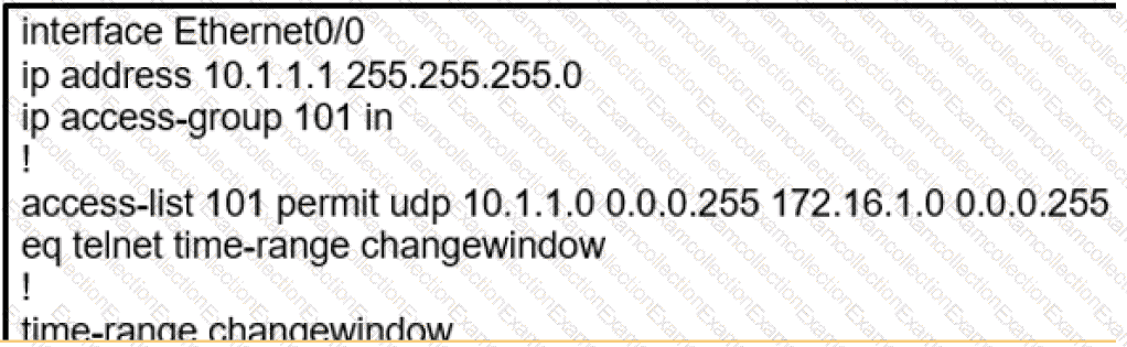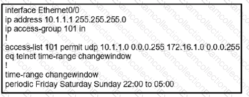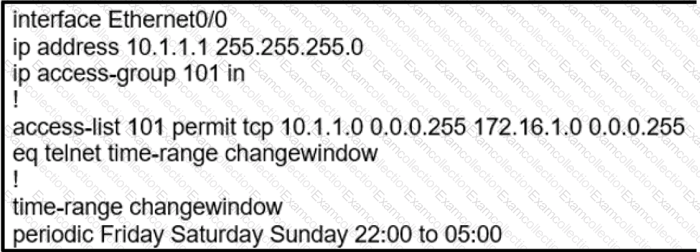 configuration that permits a Telnet connection from the inside network (Eth0/0) to the outside of the networking between Friday – Sunday night hours only. Which configuration resolves the issue?