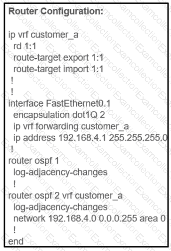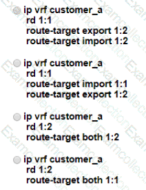 The network administrator configured VRF lite for customer A. The technician at the remote site misconfigured VRF on the router. Which configuration will resolve connectivity for both sites of customer_a?