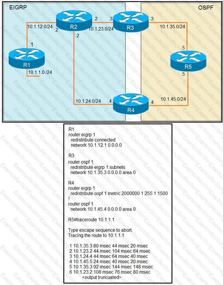The output of the trace route from R5 shows a loop in the network. Which configuration