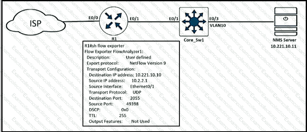 An engineer configured NetFlow on R1, but the NMS server cannot see the flow from R1. Which configuration resolves the issue?