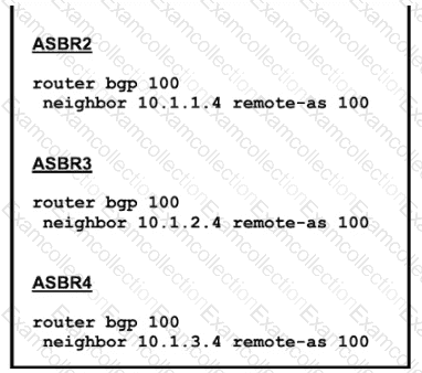 Refer to the exhibit The administrator configured the network devices for end-to-end reachability, but the ASBRs are not propagating routes to each other Which set of configurations resolves this issue?