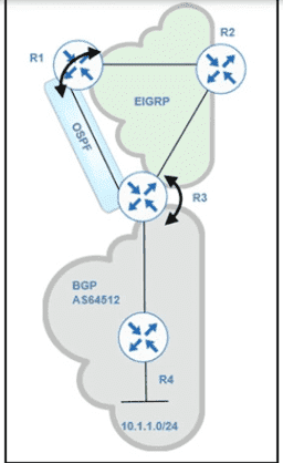 Routing protocols are mutually redistributed on R3 and R1. Users report intermittent connectivity to services hosted on the 10.1.1.0/24 prefix. Significant routing update changes are noticed on R3 when the show ip route profile