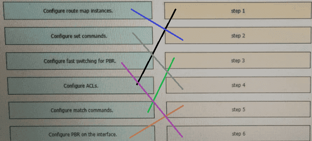 Drag and drop the actions from the left into the correct order on the right to configure a policy to avoid following packet forwarding based on the normal routing path.