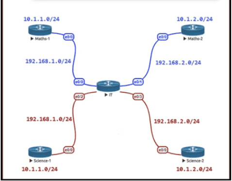 The Math and Science departments connect through the corporate. IT router but users in the Math department must not be able to reach the Science department and vice versa Which configuration accomplishes this task?