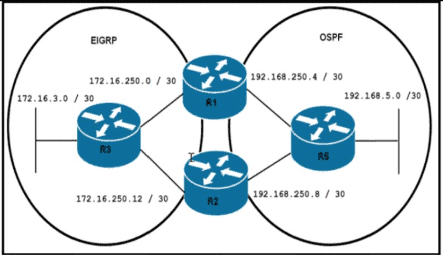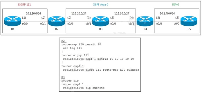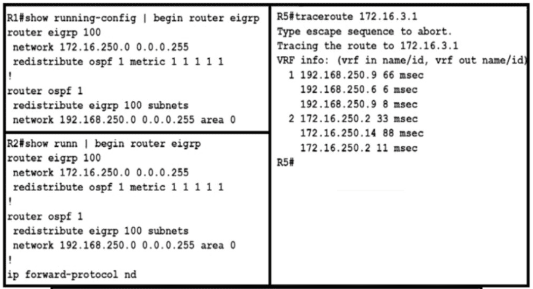 R5 should not receive any routes originated in the EIGRP domain. Which set of configuration changes removes the EIGRP routes from the R5 routing table to fix the issue?
