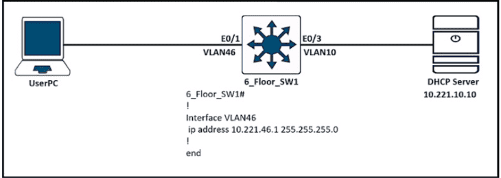 Users in VLAN46 cannot get the IP from the DHCP server. Assume that all the parameters are configured properly in VLAN 10 and on the DHCP server Which command on interlace VLAN46 allows users to receive IP from the DHCP server?