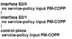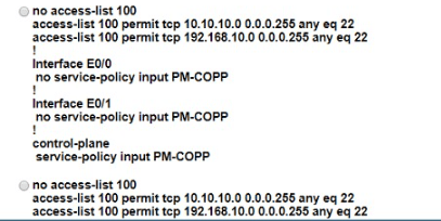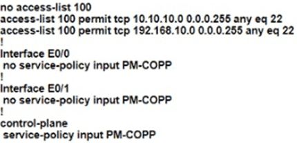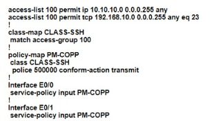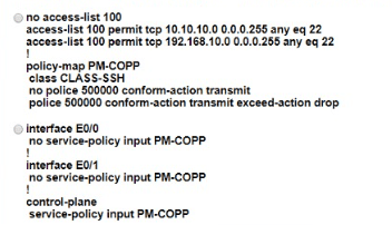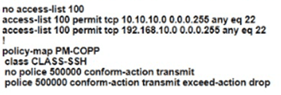 The network administrator configured the router for Control Plane Policrg so that inbound SSH traffic is policed to 500 kbps This policy must apply to traffic coming in from 101010 0<24 and 192 168 10.0/24 networks