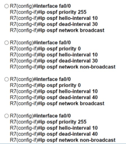 Refer to the exhibit. Router R4 is configured correctly with default OSPF values. A network engineer configured R7 for OSPF. R7 must not be elected as a DR for the segment between R4-R7. The adjacency between R4 and R7 failed to form. Which configuration resolves the issue?