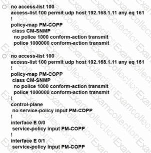 The network administrator configured CoPP so that all SNMP traffic from Cisco Prime located at 192.168.1.11 toward the router CPU is limited to 1000 kbps. Any traffic that exceeds this limit must be dropped.
