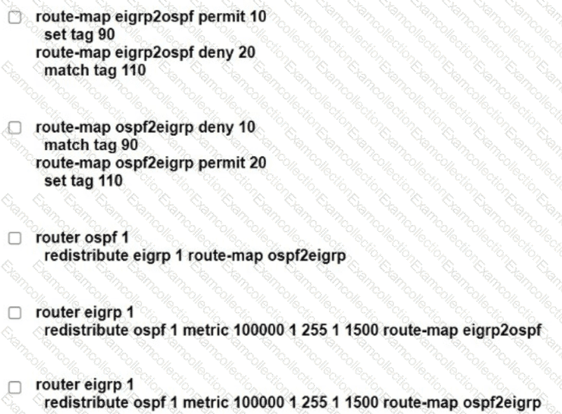 Refer to the exhibit. Which two configurations are required on R2 to prevent a routing loop caused by the redistribution from OSPF back into EIGRP? (Choose two.)