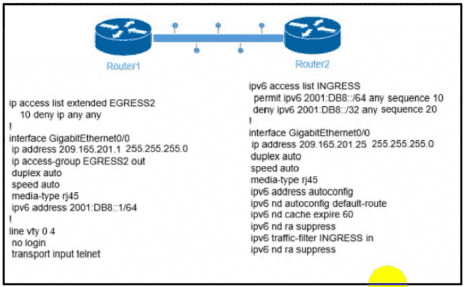 Refer to the exhibit. The engineer configured and connected Router2 to Router1. The link came up but could not establish a Telnet connection to Router1 IPv6 address of 2001:DB8::1. Which configuration allows Router2 to establish a Telnet connection to Router1?