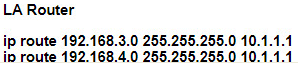 A user on the 192.168.1.0/24 network can successfully ping 192.168.3.1, but the administrator cannot ping 192.168.3.1 from the LA router. Which set of configurations fixes the issue?