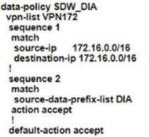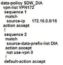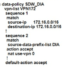 An engineer is configuring the branch office with a 172.16.0.0/16 subnet to use DIA for Internet traffic. All other traffic must flow to the central site or branches using the MPLS circuit Which configuration meets the requirement?