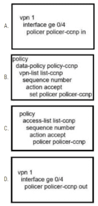 An administrator wants to create a policy to add a traffic policer called "politer-ccnp" to police data traffic on the WAN Edge. Which configuration accomplishes this task in vSmart?