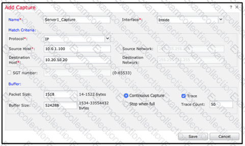An engineer is troubleshooting a device that cannot connect to a web server. The connection is initiated from the Cisco FTD inside interface and attempting to reach 10.0.1.100 over the non-standard port of 9443 The host the engineer is attempting the connection from is at the IP address of 10.20.10.20. In order to determine what is happening to the packets on the network, the engineer decides to use the FTD packet capture tool Which capture configuration should be used to gather the information needed to troubleshoot this issue?