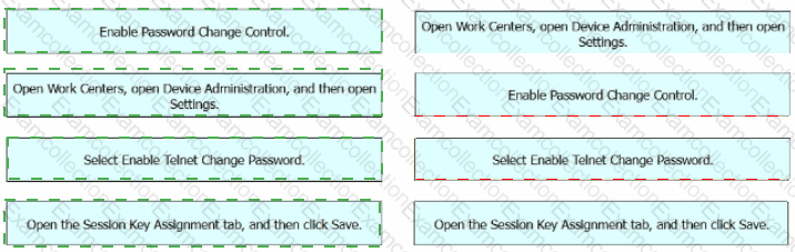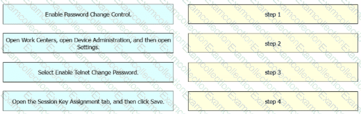 An engineer must configure Cisco ISE to be used as the TACACS+ server for any administrator that signs into the router. Users must be able to change their Telnet password through the TACACS+ server. Drag and drop the configuration steps from the left into the sequence on the right.