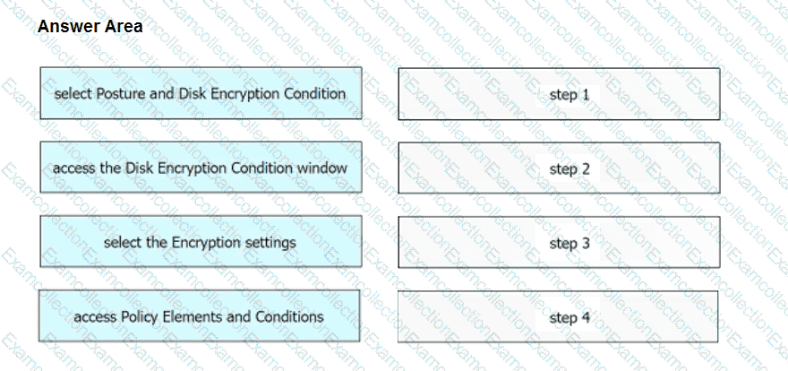 An engineer needs to configure a compliance policy on Cisco ISE to ensure that the latest encryption software is running on the C drive of all endpoints. Drag and drop the configuration steps from the left into the sequence on the right to accomplish this task.