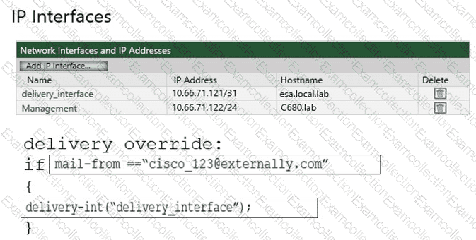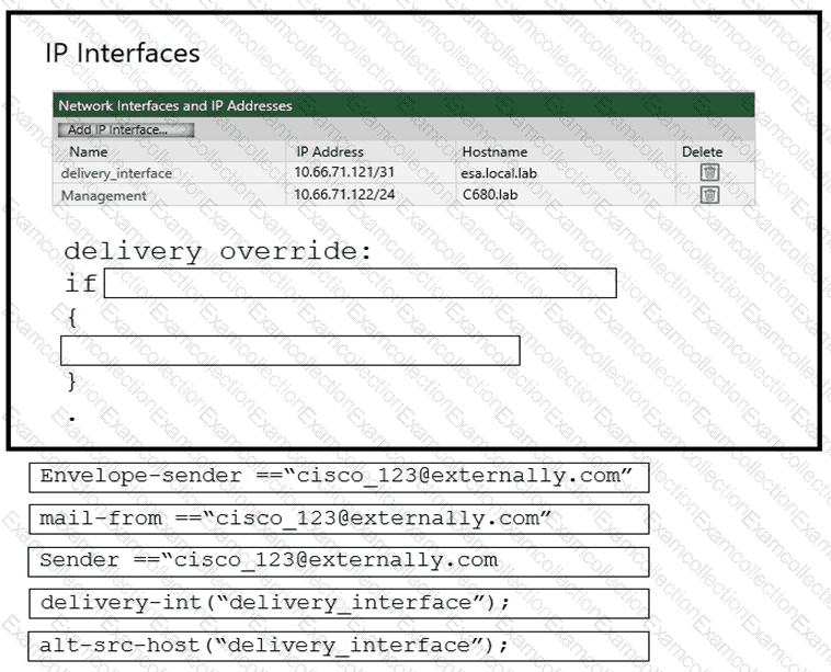 An administrator must ensure that emails sent from cisco_123@externally.com are routed through an alternate virtual gateway. Drag and drop the snippet from the bottom onto the blank in the graphic to finish the message filter syntax. Not all snippets are used.