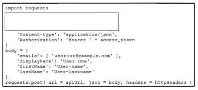 A collaboration engineer needs to create a new Webex user. Which code snippet must be placed in the blank in the code to meet