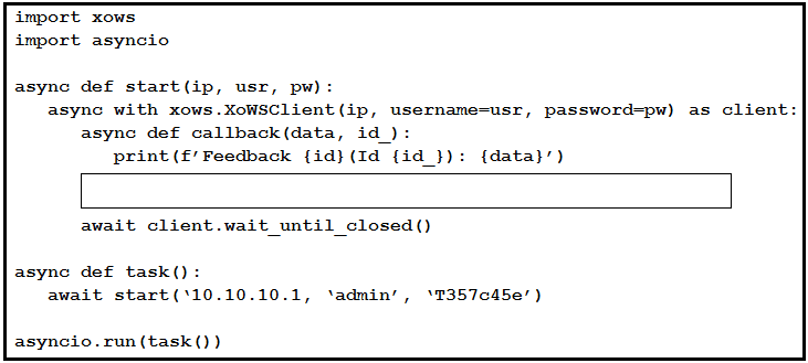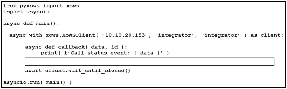 This exhibit is a simple Python scrip to monitor call activity for a local Webex room device. Which code snippet listens for call events and completes the script?