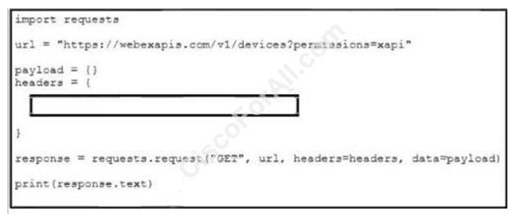 An engineer needs to retrieve a list of devices that are xAPI enabled using Webex devices xAPIs with access token 111111111AAAAaaaaaa11111aaA. To complete the python request, which line of code must be added to the box where the code is missing?