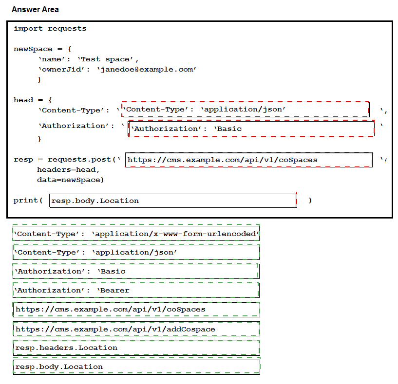 Drag and drop the code to create a valid Cisco Meeting Server REST API Python script that creates a CMS coSpace and prints the URI to the console. Not all options are used.