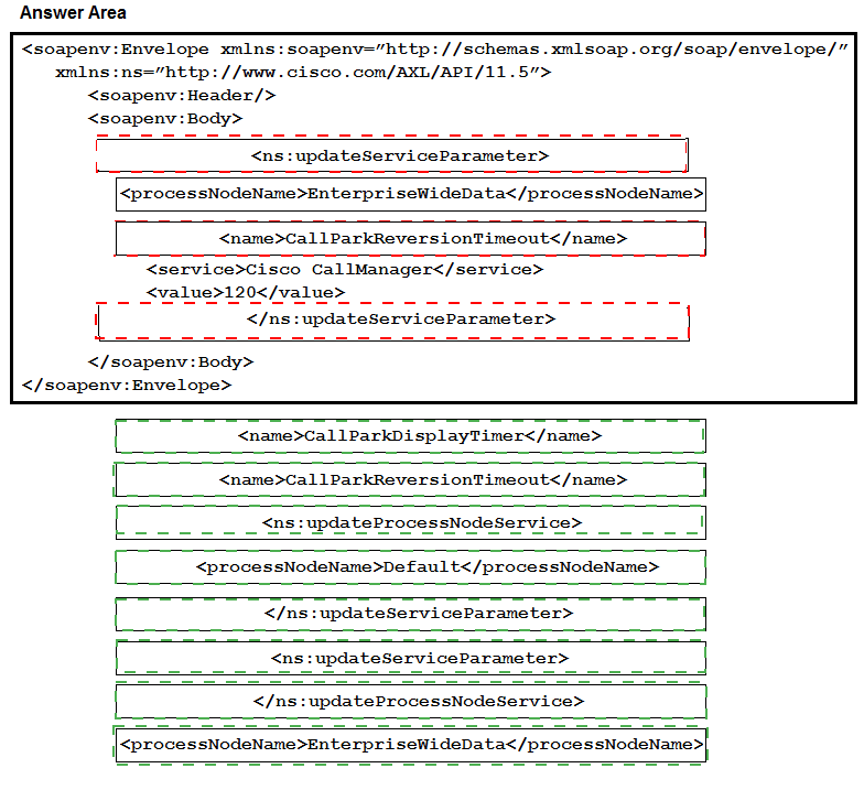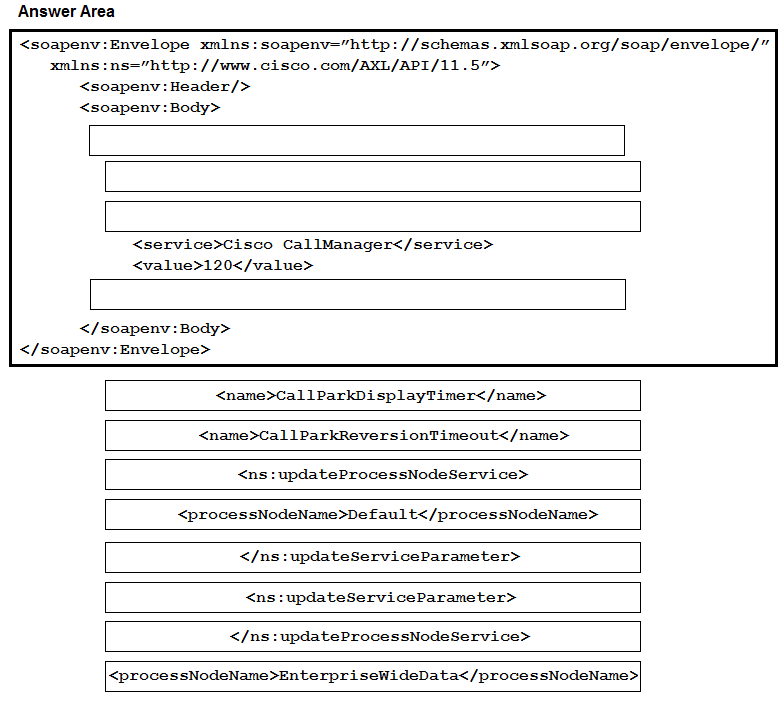 Drag and drop the XML snippets onto the AXL request to build a request that sets the cluster-wide Call Park Reversion Timer to 2 minutes. Not all options are used.