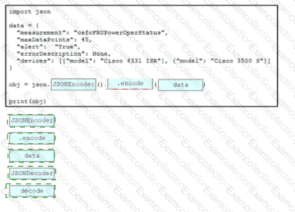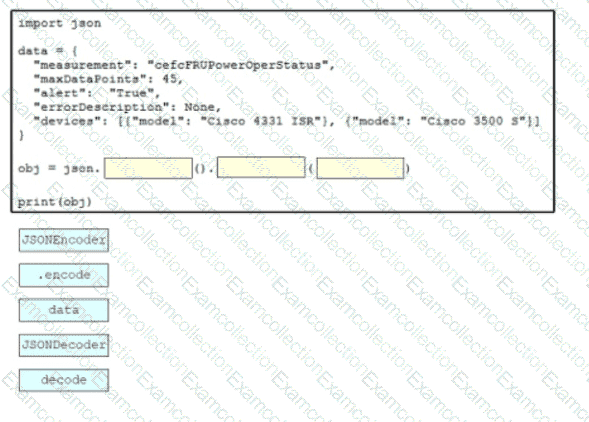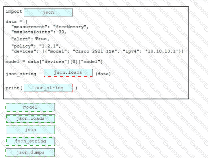 Drag and drop the code snippets from the bottom onto the blanks in the Python script to convert a Python object into a JSON string. Not all options are used.