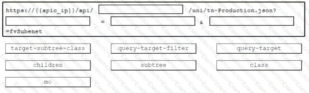 Drag and drop the keywords onto the URL request to collect all the subnets configured under tenant Production using a REST API. Not all options are used.
