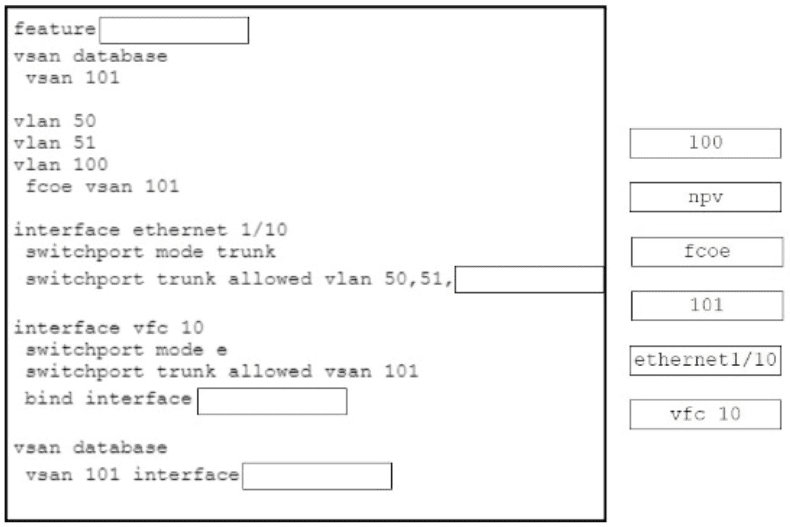 Refer to the exhibit. Server 1-must establish an FCoE connection with SW1. Drag and drop the code snippets from the right onto the boxes in the code to complete the FCoE configuration of SW1. Not all code snippets are used.