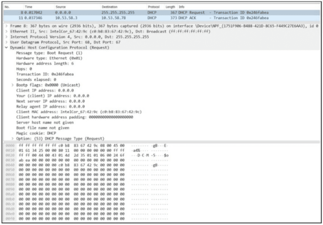 Refer to the exhibit An engineer analyzes a Wireshark packet flow between a PC and a DHCP server What occurs in the packet flow?