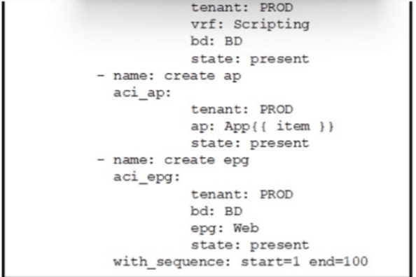 Refer to the exhibit. A network engineer uses Ansible to automate the provisioning of different ACI tasks. The current design requires that each application profile has a single applications. All application EPGs must belong to the same configured bridge domain Which set of actions must be taken to accomplish this goal?