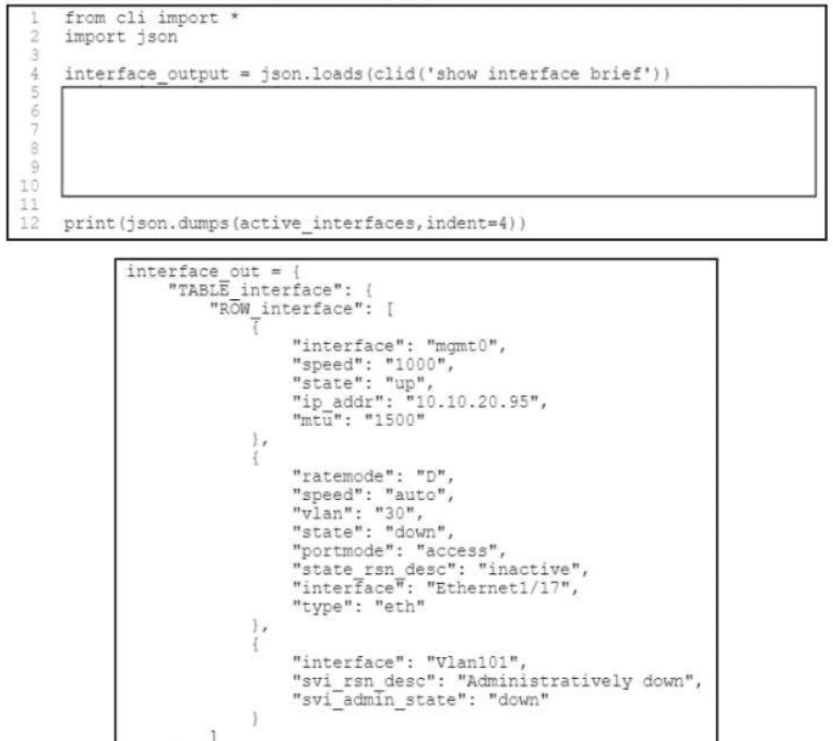 Refer to the exhibit An engineer creates a Python script to run in the native Python environment of a Cisco Nexus 9000 Series Switch The standard output of the script displays a list of the names of active interfaces on the switch Which code snippet parses the content of the interface_output variable to create the specified list?