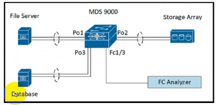 Refer to the exhibit. A storage engineer must monitor the traffic from the file server to the FC analyzer. The file server and the database use the same storage array. Which configuration must be applied to the Cisco MDS 9000 Series Switch to accomplish this goal?