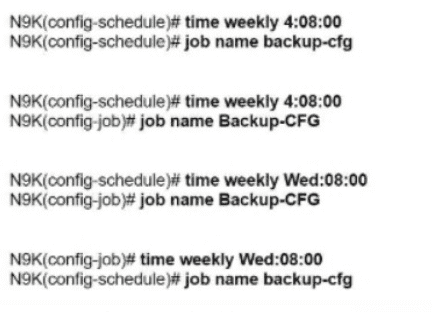 Refer to the exhibit. Which command set must be used to complete the configuration that configures a Cisco Nexus 9000 Series server scheduler to perform the backup of It’s configuration every Wednesday at 8:00 am?