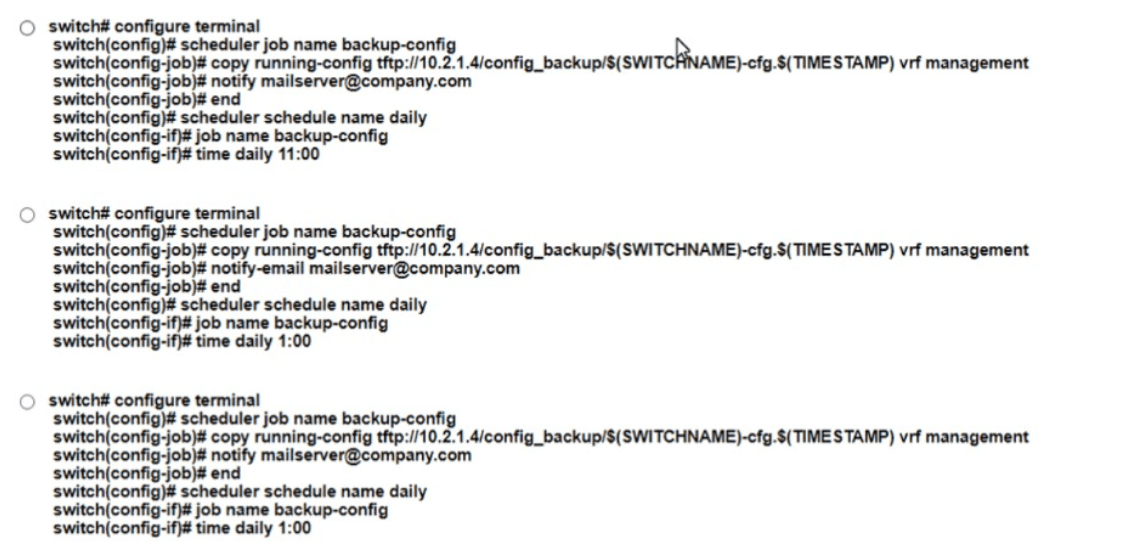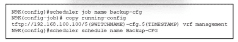 A network administrator must create a daily scheduler job on a Cisco Nexus 9000 Senes Switch to back up the device configuration and transfer the backed-up configuration to an external server The backup task must meet these requirements