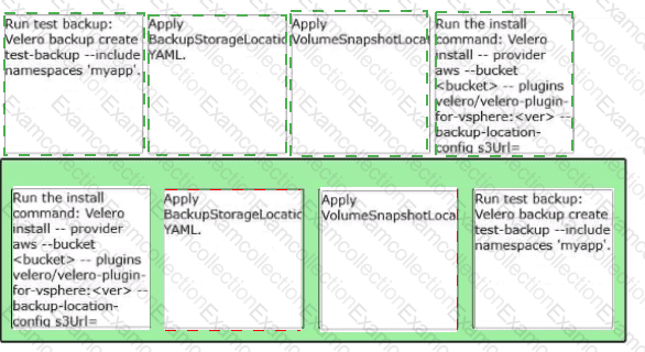A VMware Administrator is tasked with implementing a backup and restore strategy using Velero and external object storage for the namespace 'myapp1. Arrange the steps In the correct order of operations to enable Vetero.